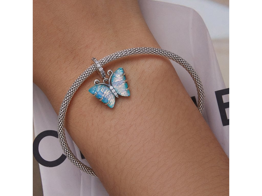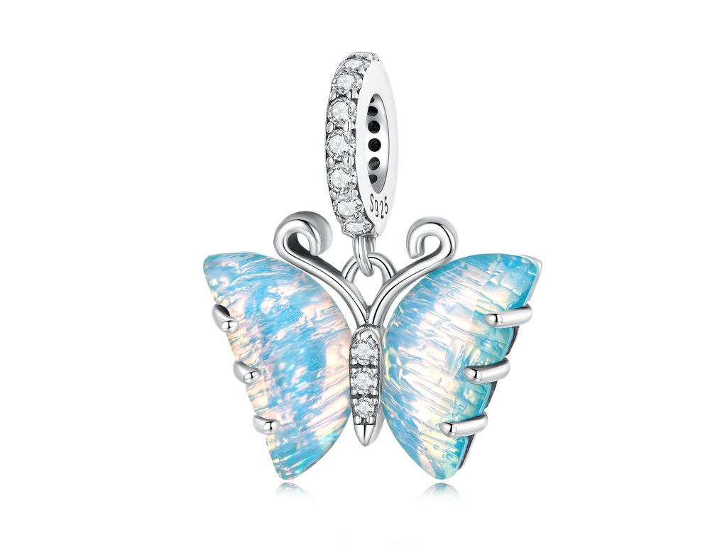- Stříbrný visací přívěsek v designu krásného motýla zdobeného zářivou modrou pryskyřicí a čirými třpytivými zirkony. Originální design přívěsku, kvalitní zpracování a materiál, ručně dohotovené.
