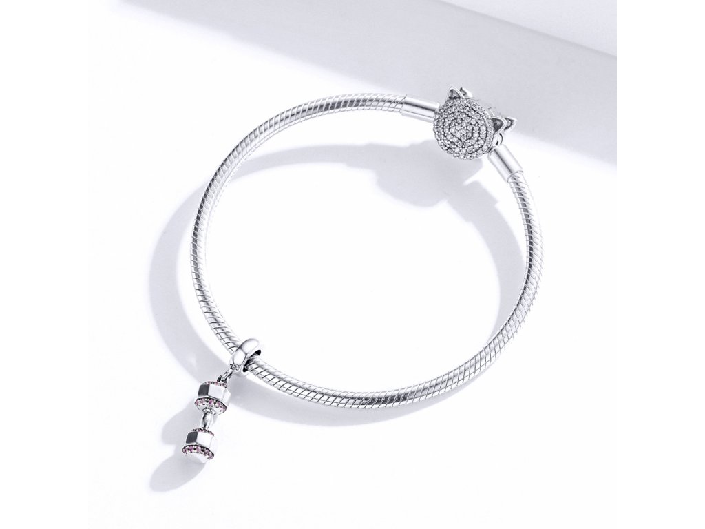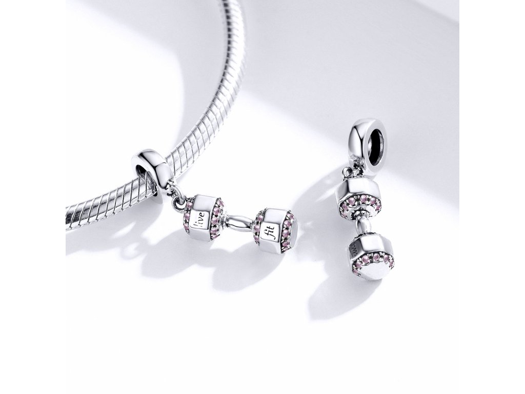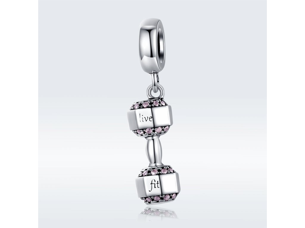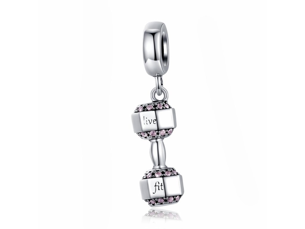 - Stříbrný visací přívěsek v designu třpytivé činky zdobené světle růžovými zirkony a anglickými nápisy "Live Fit" v překladu "Žít Fit". Originální design přívěsku, kvalitní zpracování a materiál, ručně dohotovené.