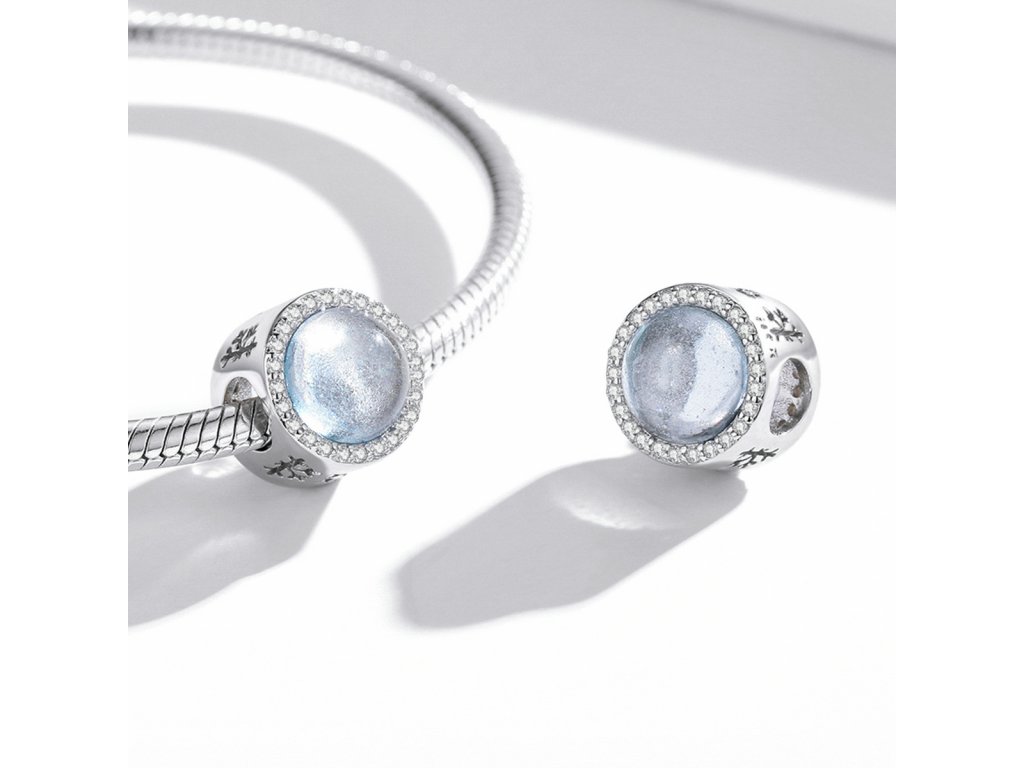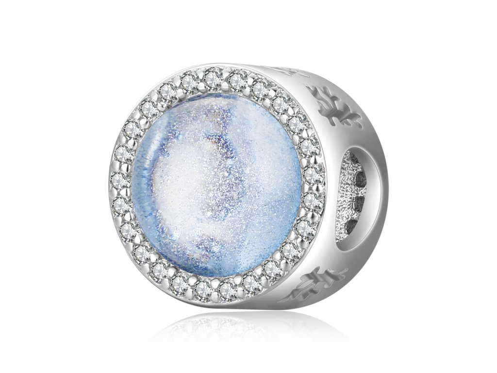 - Stříbrný kouzelný světle modrý přívěsek v designu Zimní sněhové scenérie zdobený čirými třpytivými zirkony. Přívěsek je také obohacen ručně vyřezávanými vločkami po celém svém obvodu. Originální design přívěsku, kvalitní zpracování a materiál, ručně dohotovené.