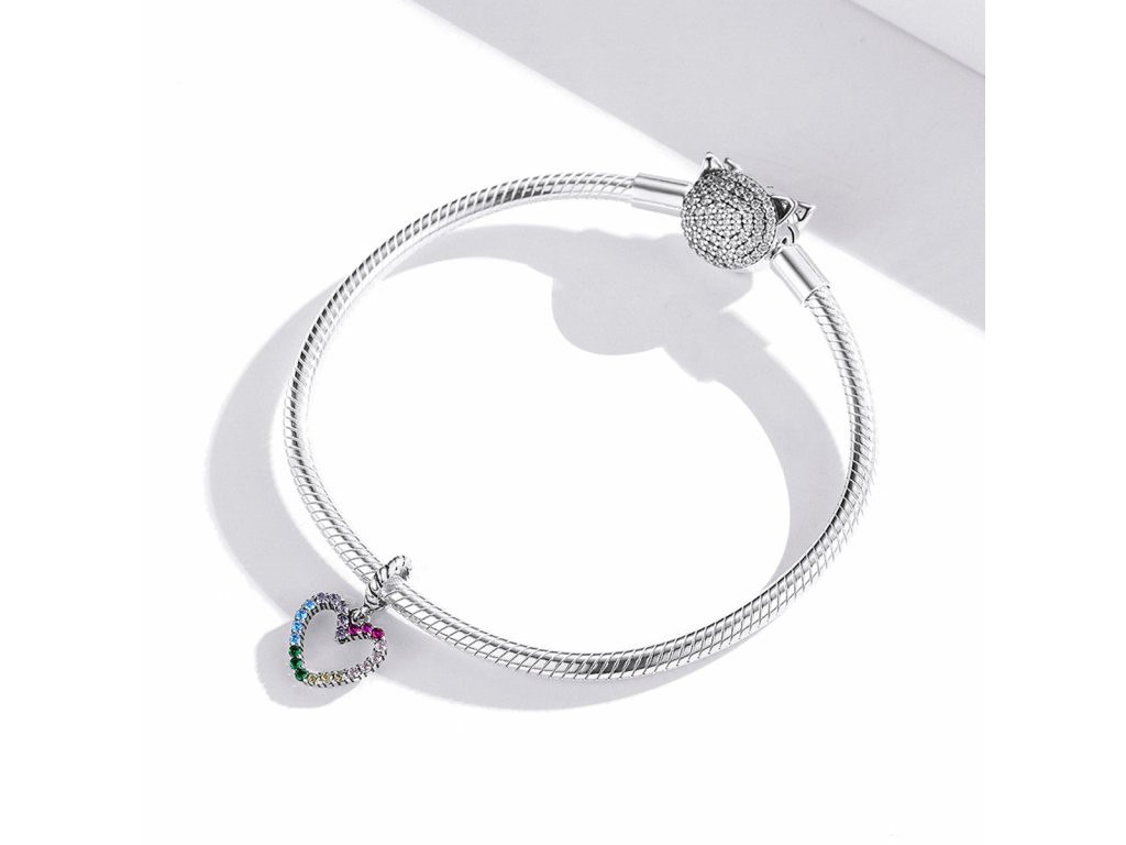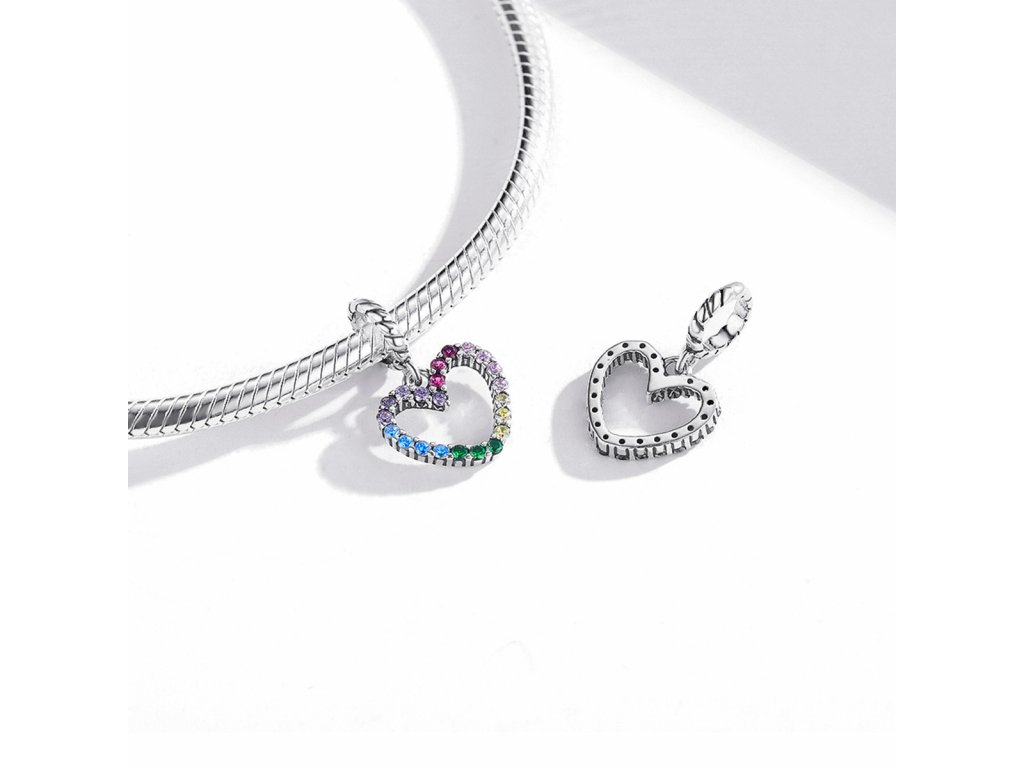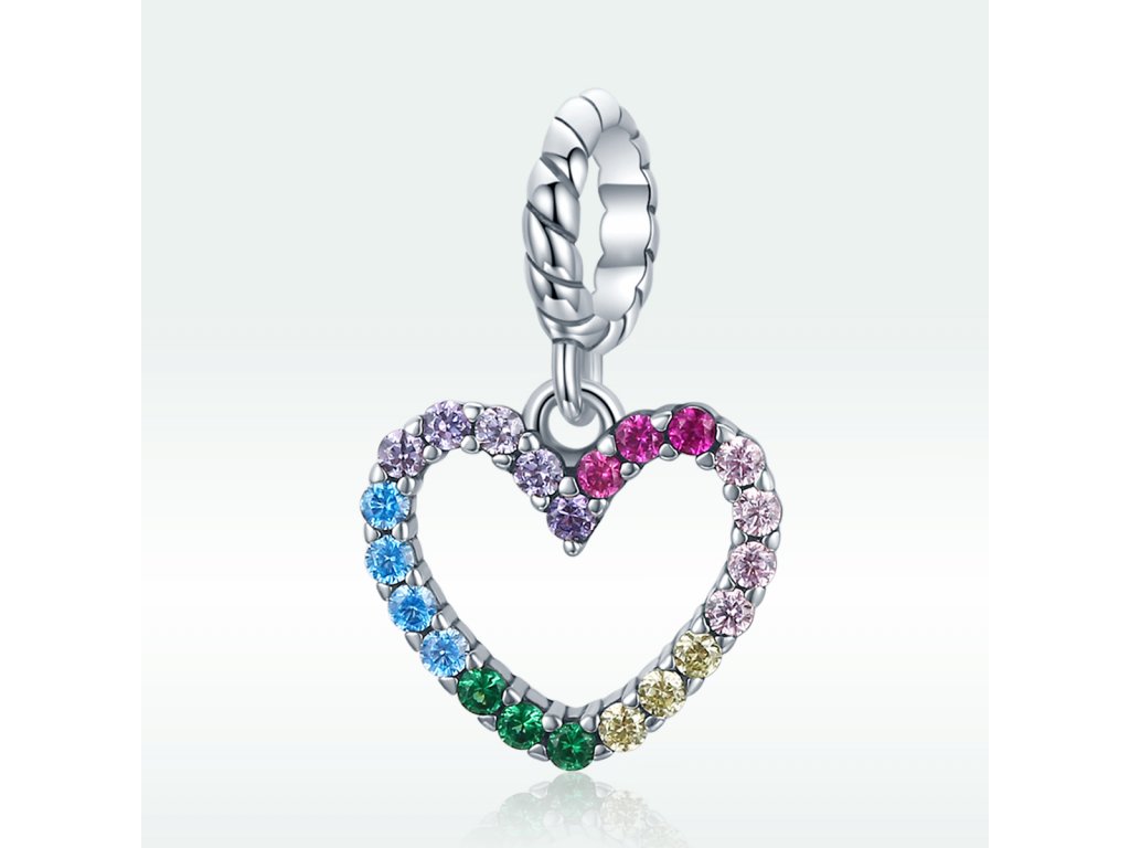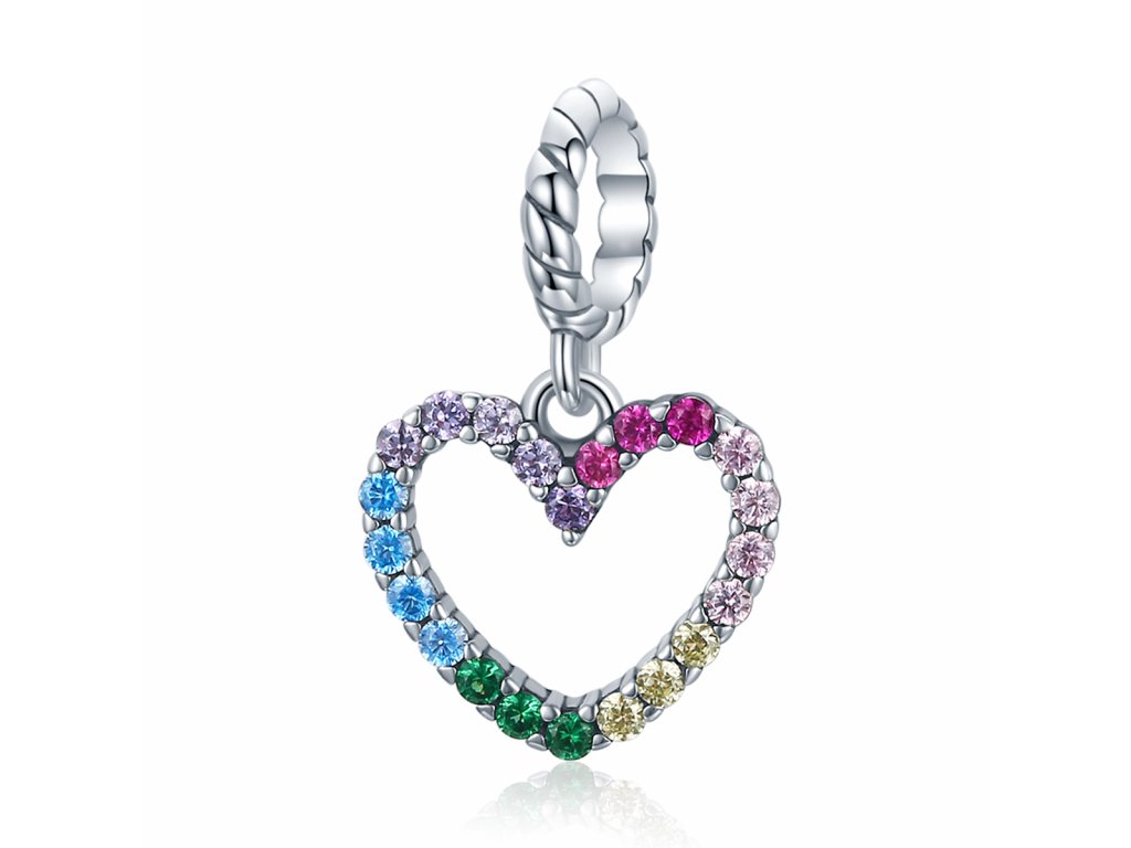 - Stříbrný visací přívěsek ve tvaru barevného srdce zdobeného třpytivými zirkony v barvách duhy. Originální design přívěsku, kvalitní zpracování a materiál, ručně dohotovené.