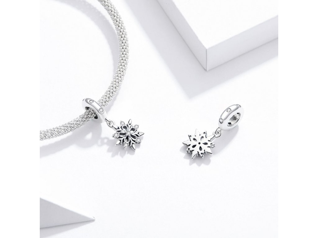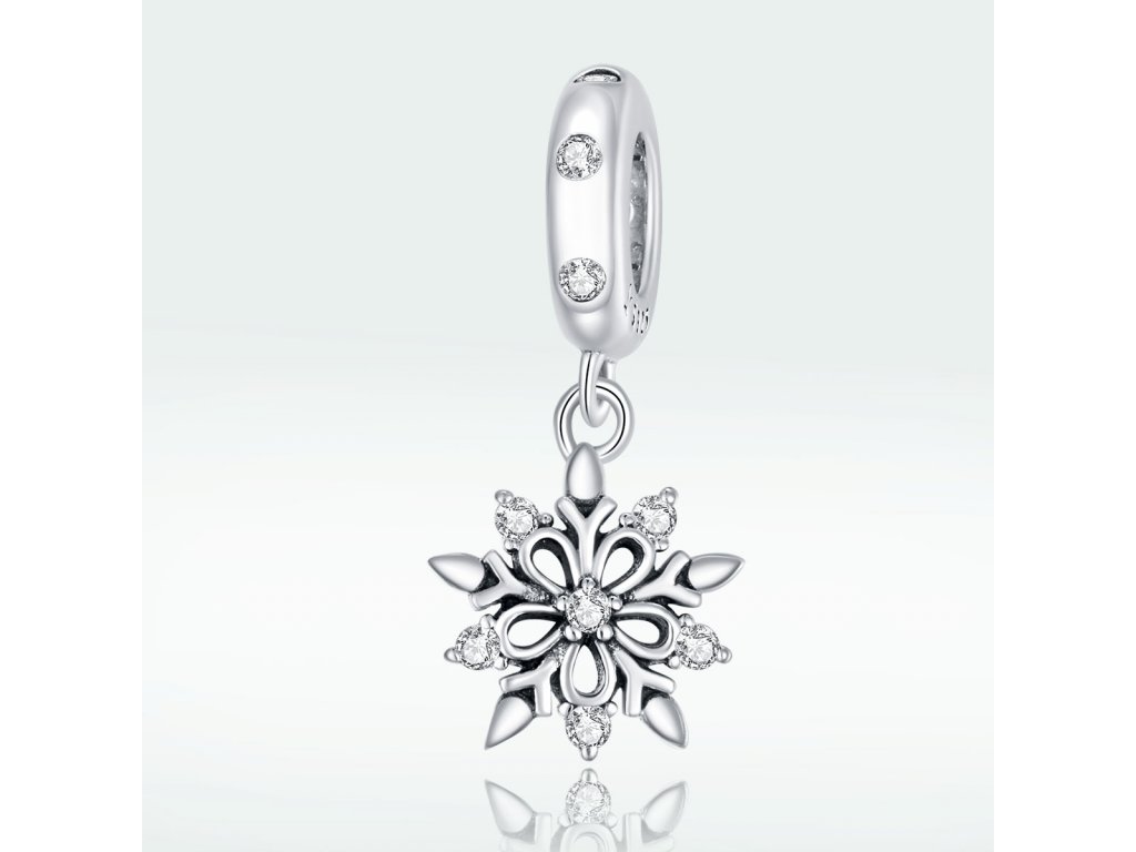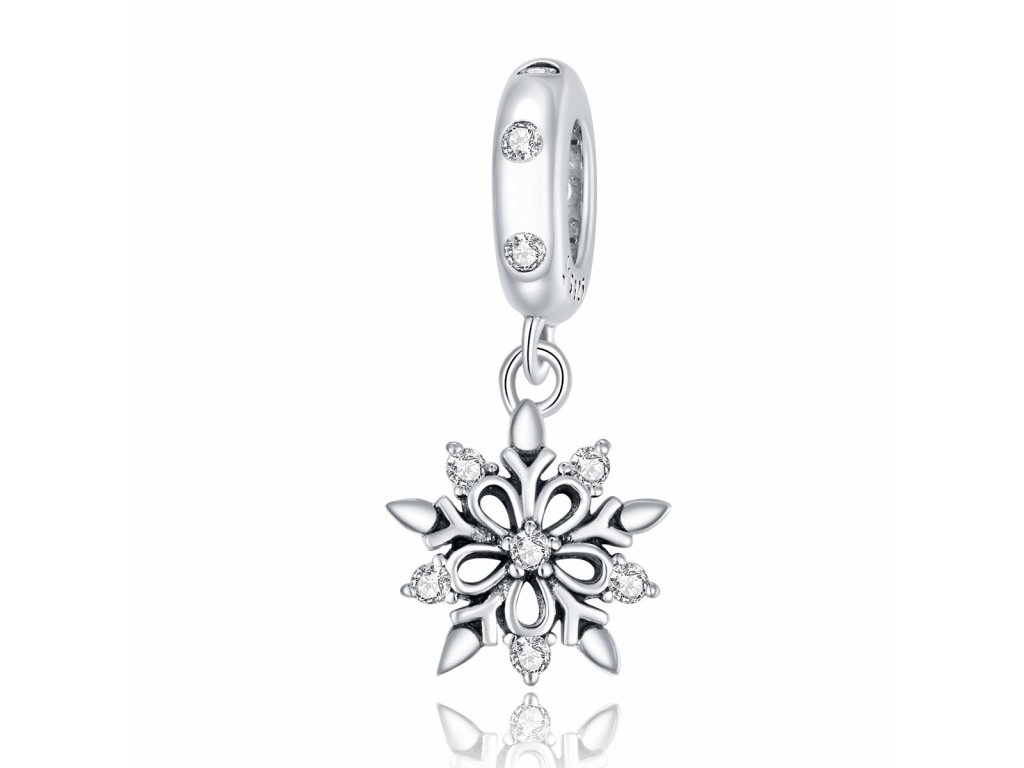 - Stříbrný visací přívěsek v designu Křišťálové vločky zdobené čirými třpytivými zirkony. Originální design přívěsku, kvalitní zpracování a materiál, ručně dohotovené.