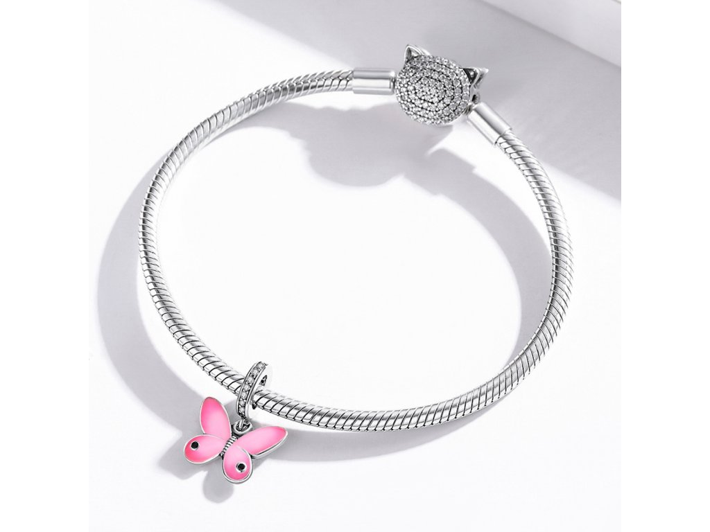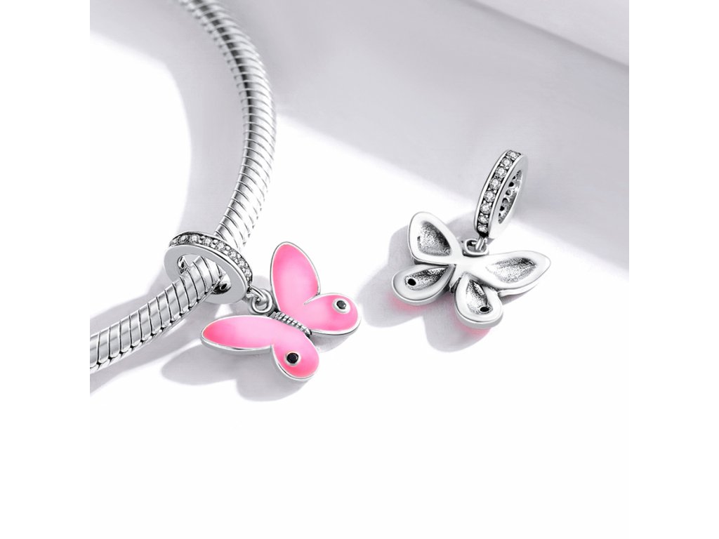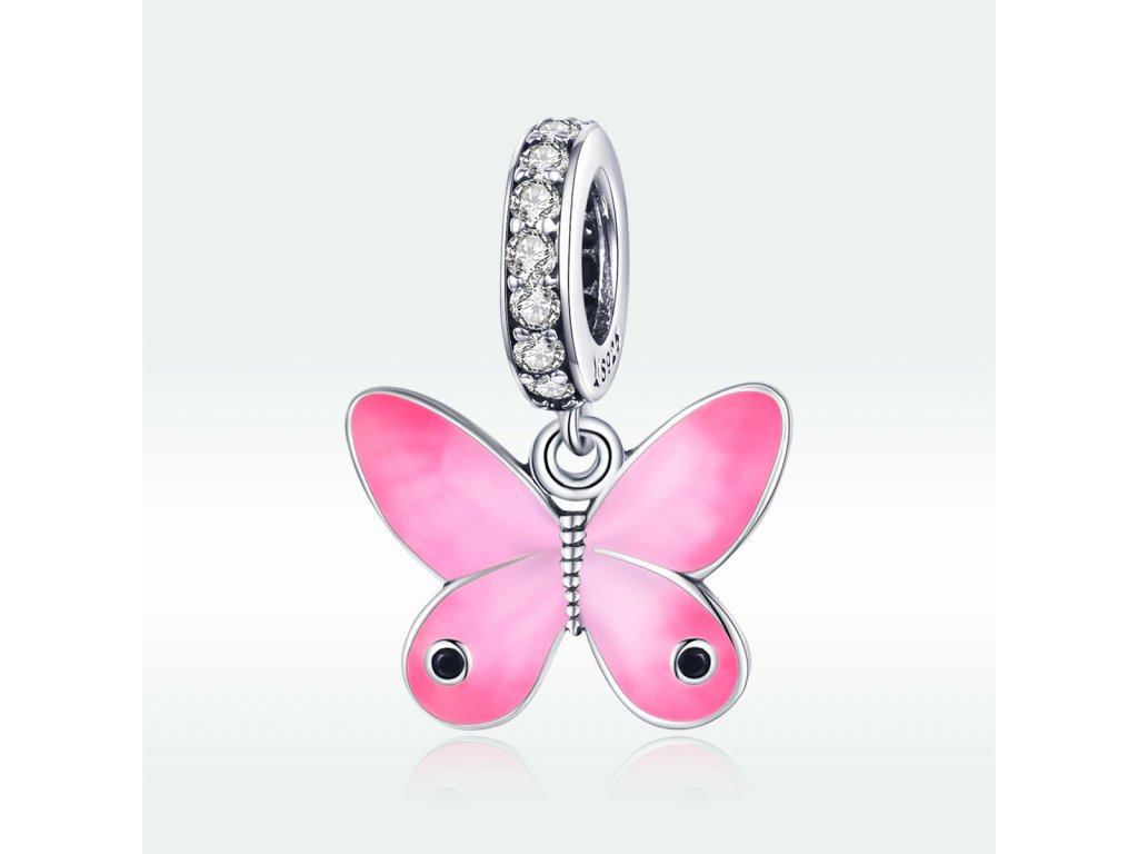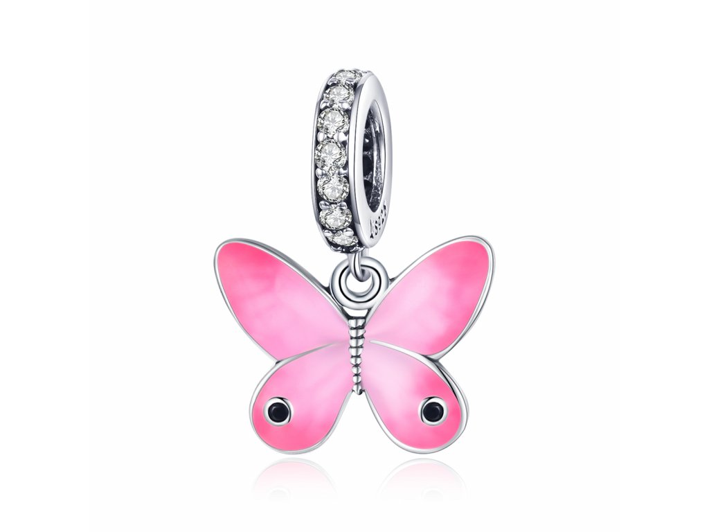 - Stříbrný visací přívěsek v designu krásného motýla zdobeného čirými třpytivými zirkony a ručně nanášenou růžovou glazurou. Originální design přívěsku, kvalitní zpracování a materiál, ručně dohotovené.
