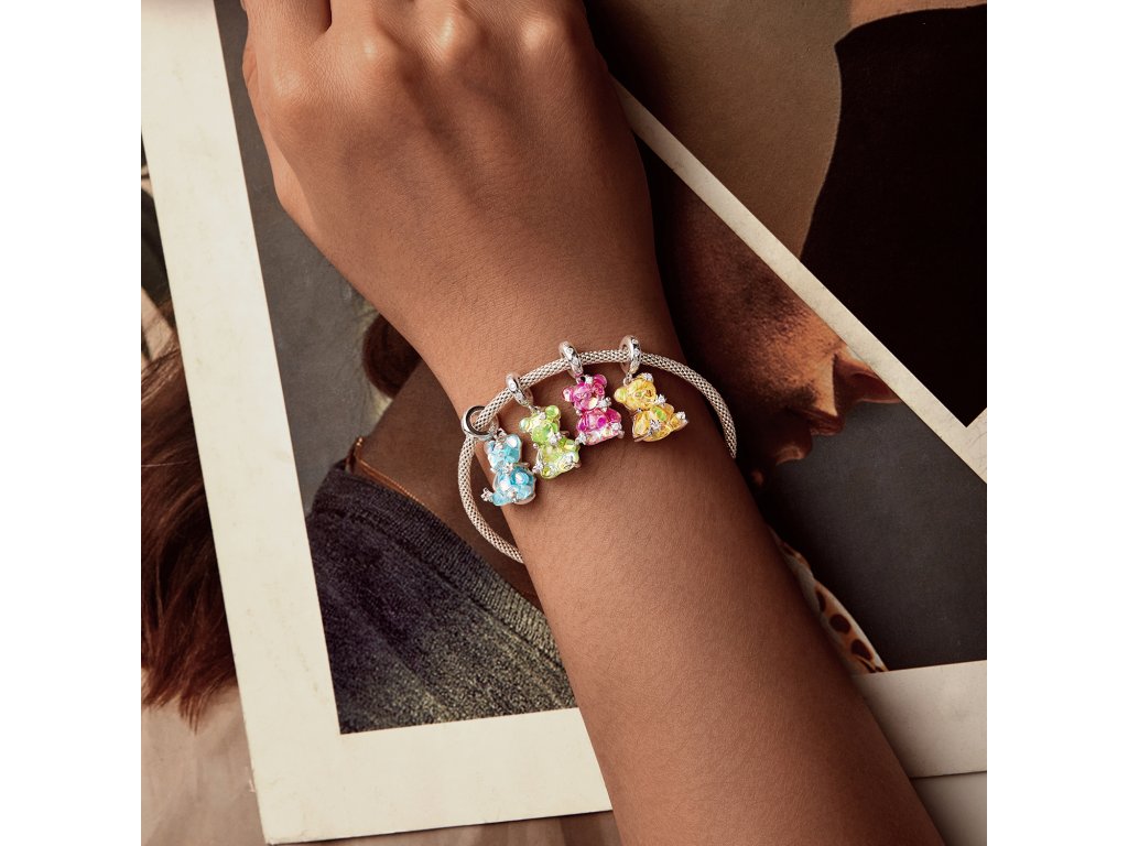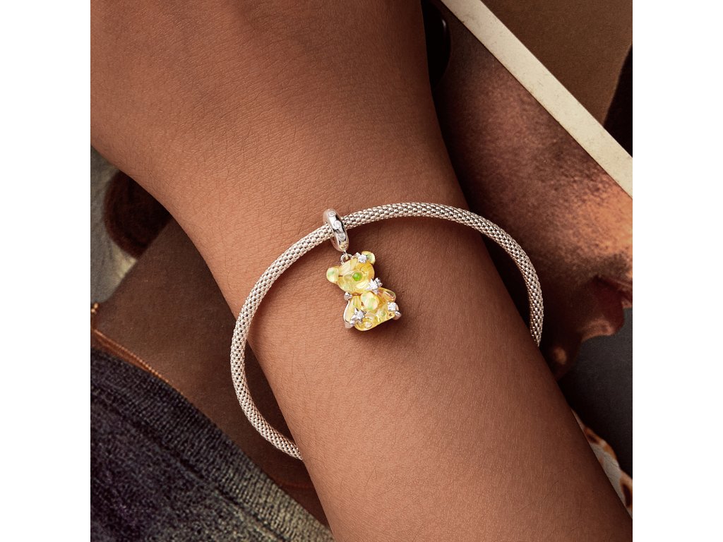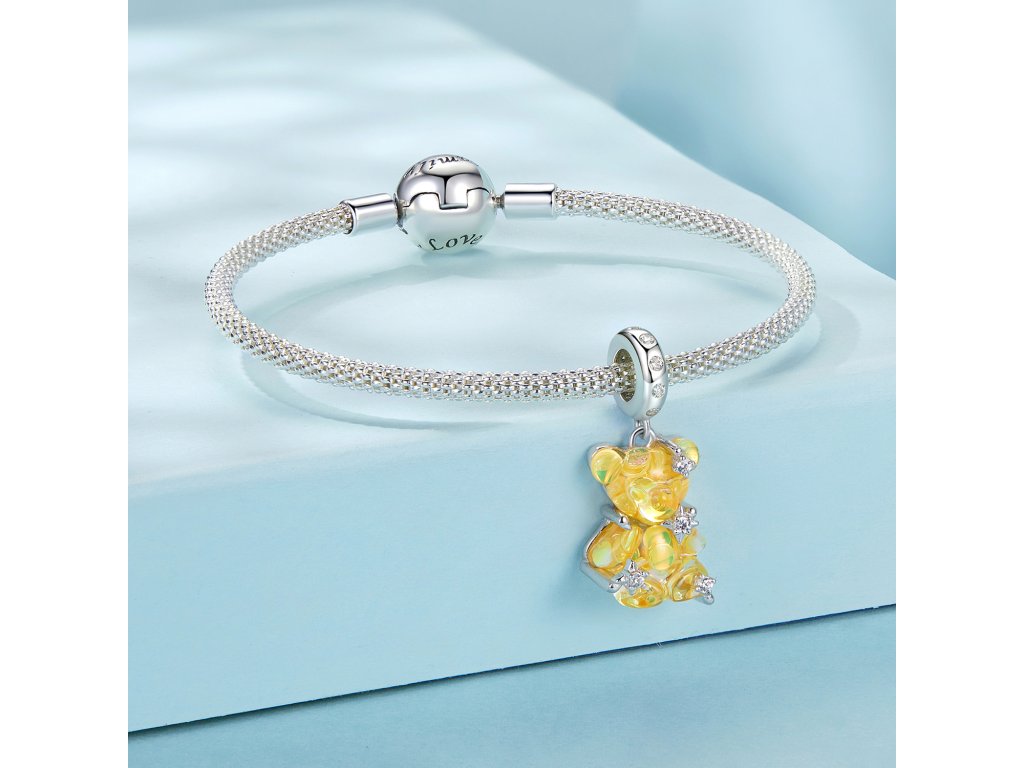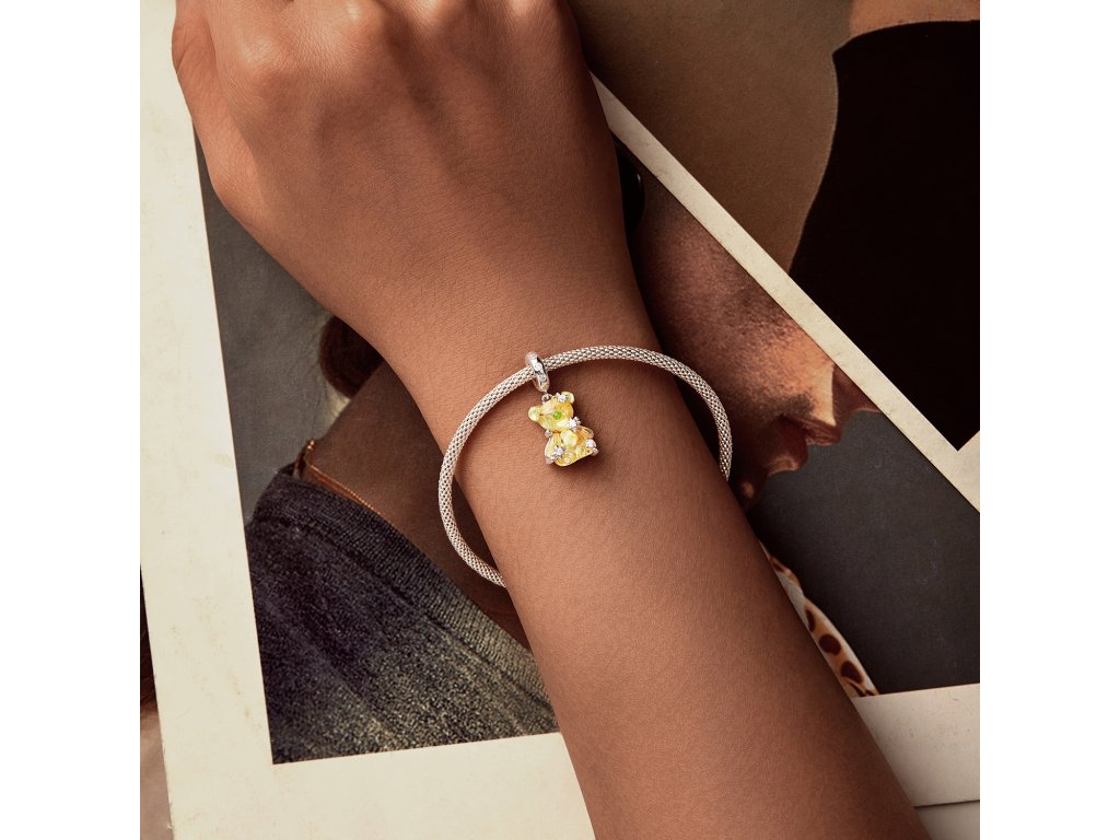 Stříbrný visací přívěsek v designu žlutého medvídka zdobeného zirkony. Precizně zpracovaný z kvalitního sterlingového stříbra.