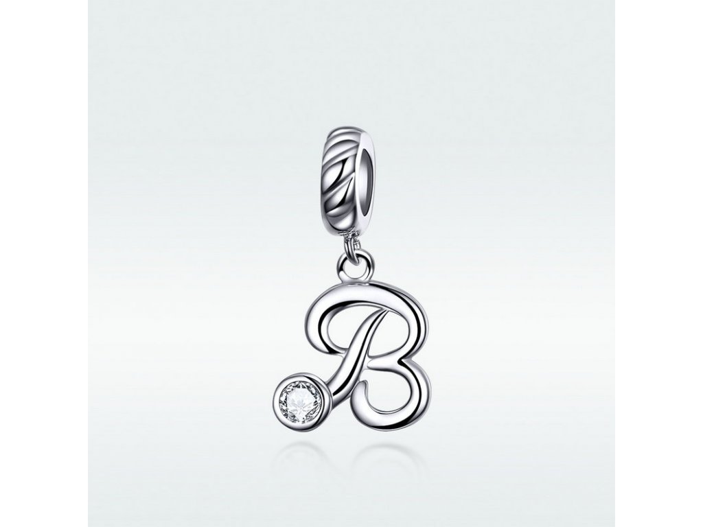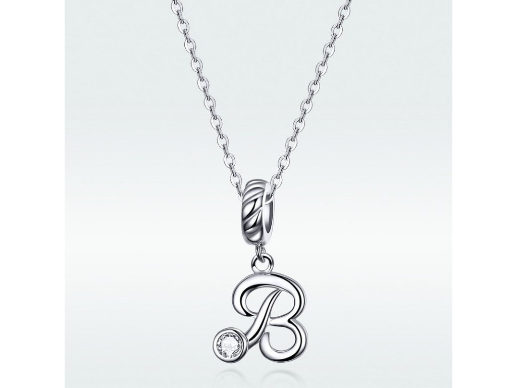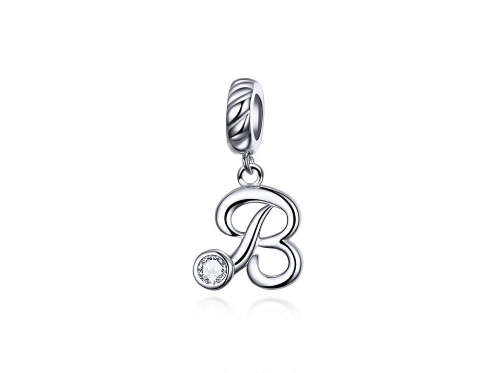 Stříbrný visací přívěsek v designu psacího písmenka "B" zdobeného čirým zirkonem. Originální design přívěsku, kvalitní zpracování a materiál, ručně dohotovené.