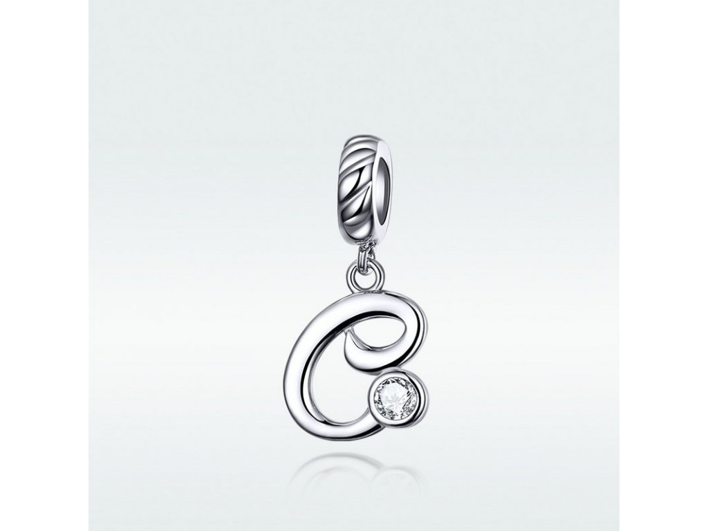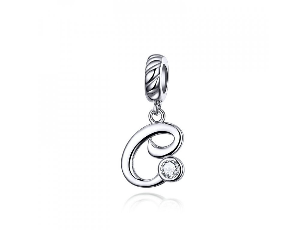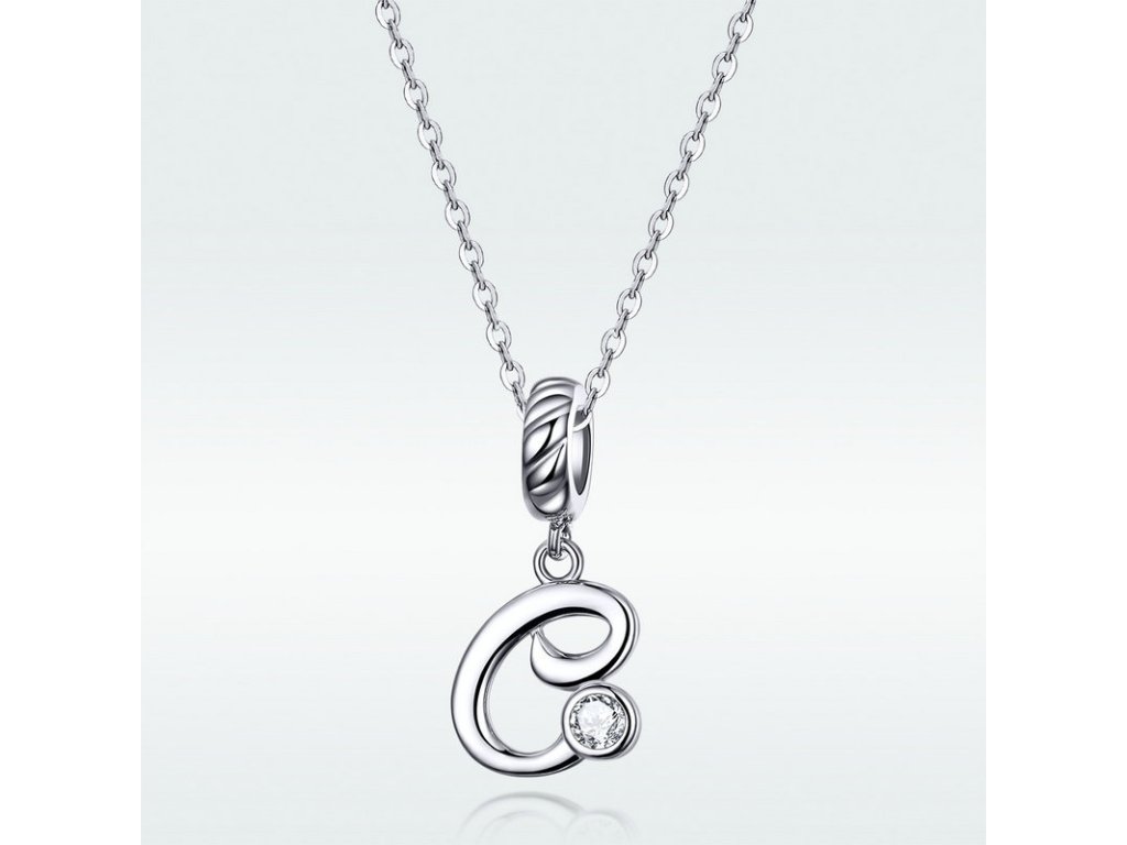 Stříbrný visací přívěsek v designu psacího písmenka "C" zdobeného čirým zirkonem. Originální design přívěsku, kvalitní zpracování a materiál, ručně dohotovené.