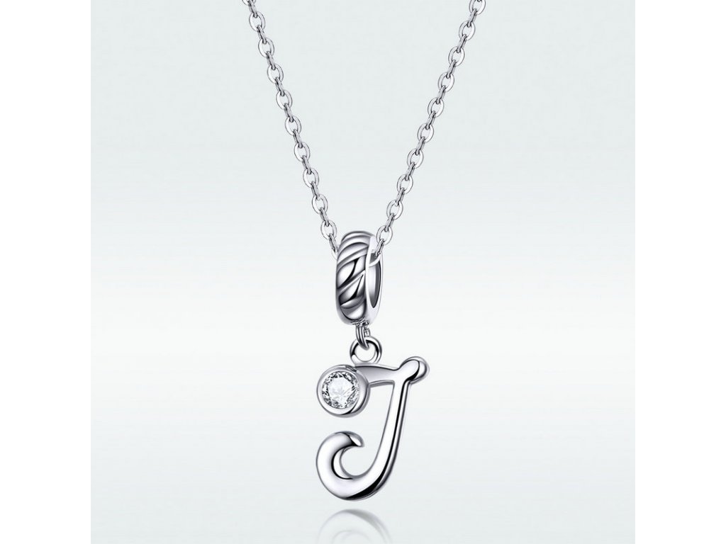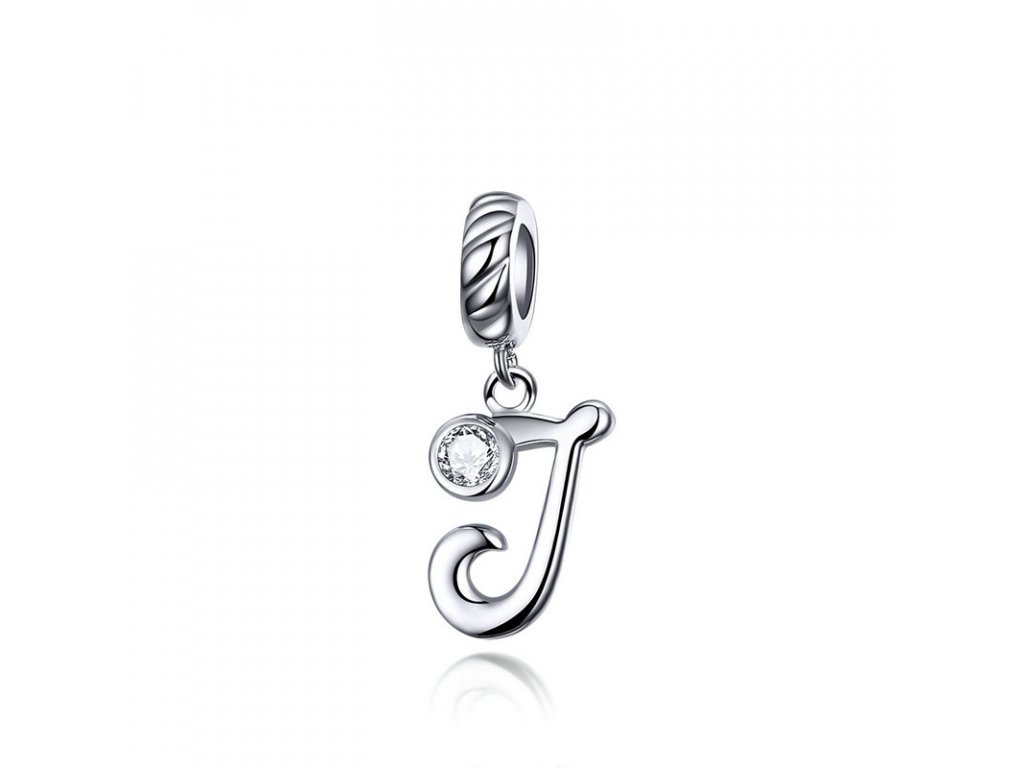 Stříbrný visací přívěsek v designu psacího písmenka "J" zdobeného čirým zirkonem. Originální design přívěsku, kvalitní zpracování a materiál, ručně dohotovené.