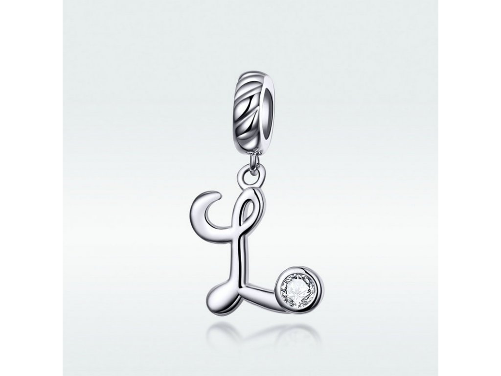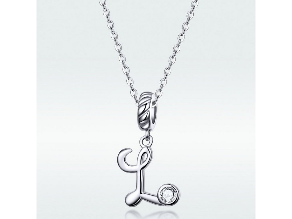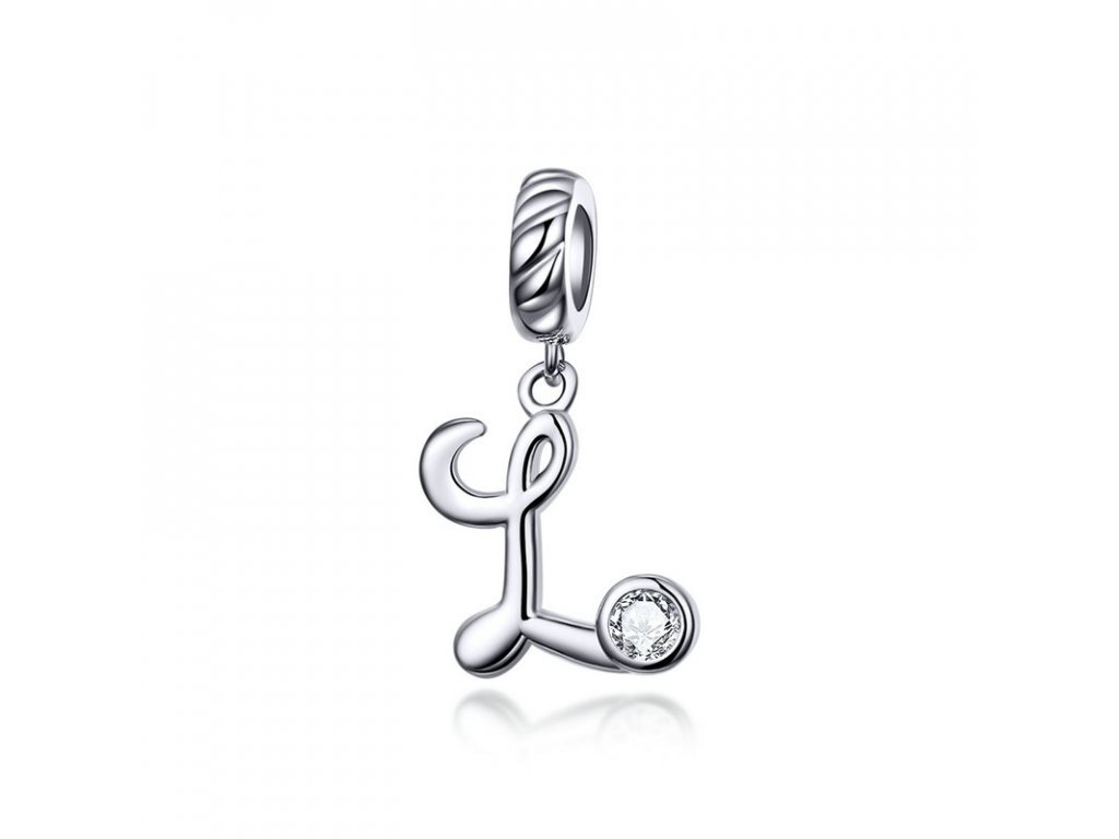 Stříbrný visací přívěsek v designu psacího písmenka "L" zdobeného čirým zirkonem. Originální design přívěsku, kvalitní zpracování a materiál, ručně dohotovené.