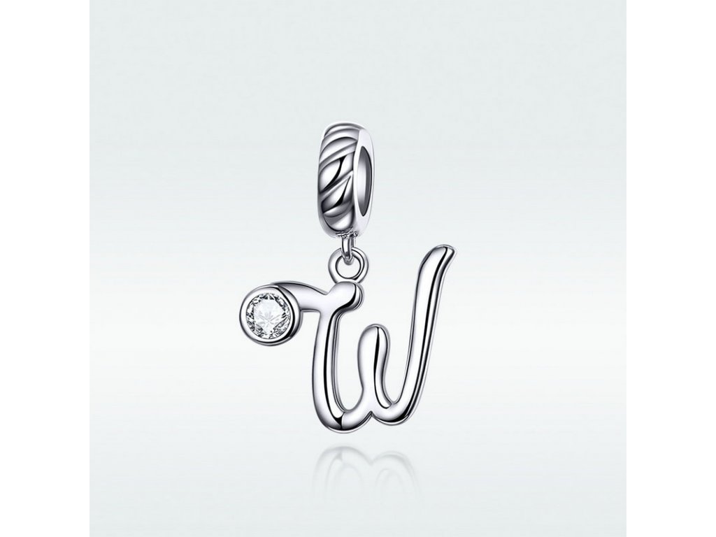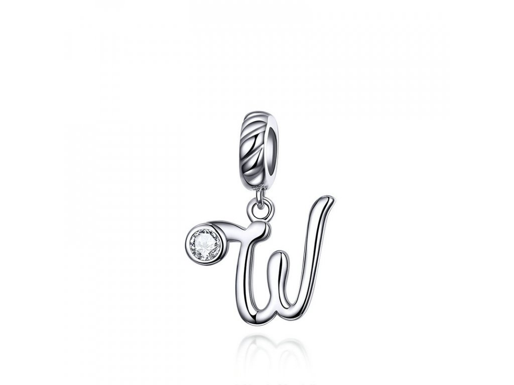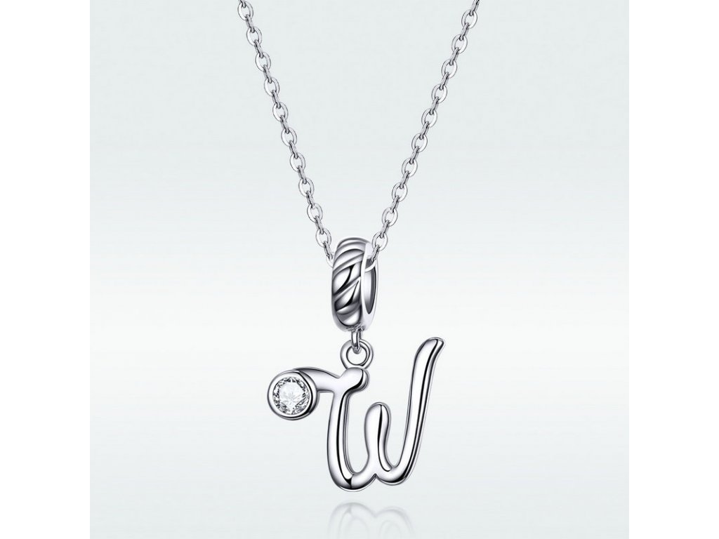 Stříbrný visací přívěsek v designu psacího písmenka "W" zdobeného čirým zirkonem. Originální design přívěsku, kvalitní zpracování a materiál, ručně dohotovené.