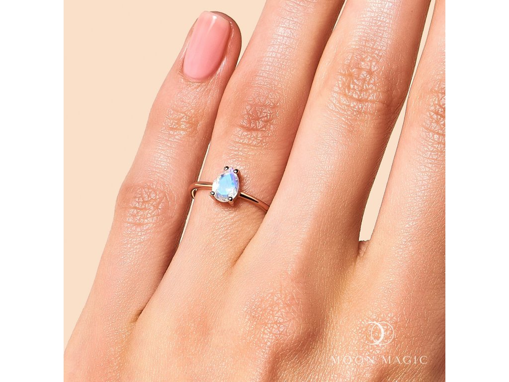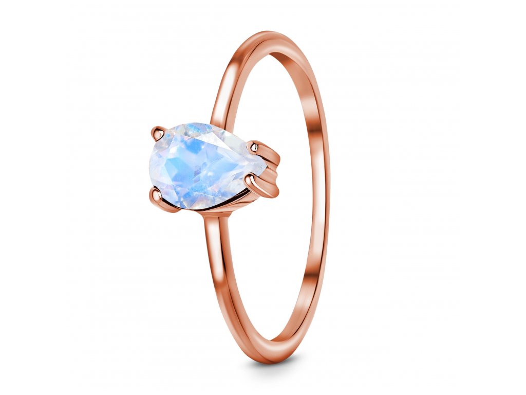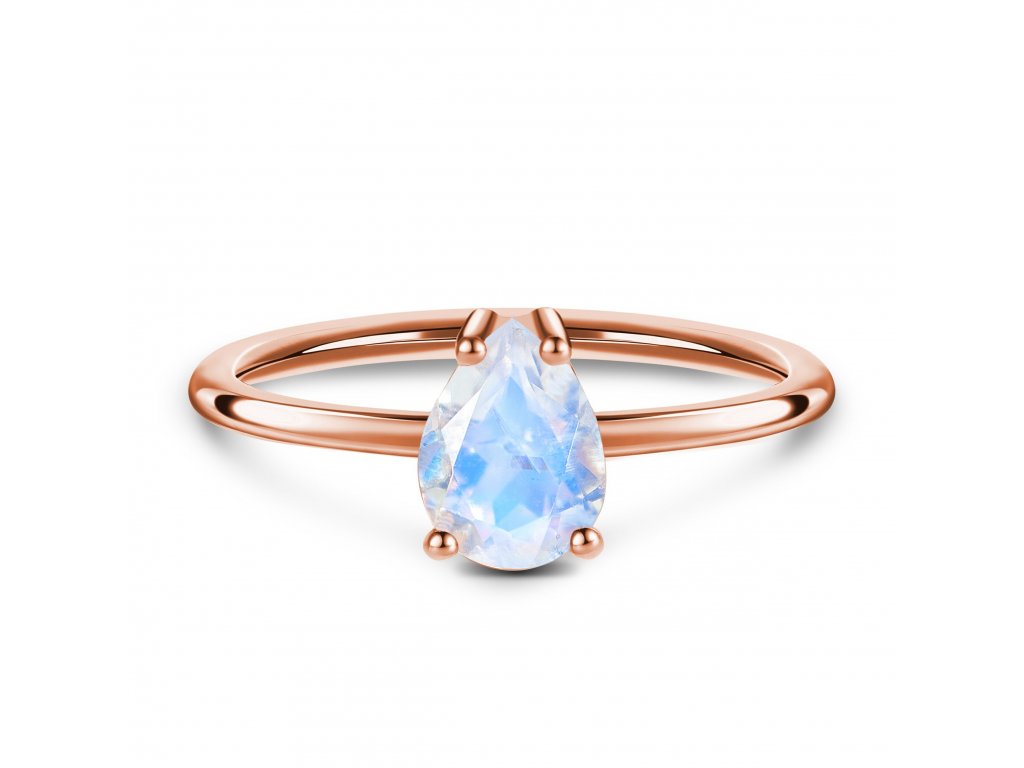 Luxusní romantický prsten ze 14ti karátového růžového zlata vermeil zdobený středně velkým měsíčním kamenem Moonstone ve tvaru kapky.